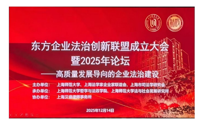 12月14日下午,由上海师范大学、上海法学家企业家联谊会、上海市司法学研究会联合主办,上海师范大学哲学与法政学院、上海师范大学法与社会发展研究所承办,上海汉盛律师事务所协办的“东方企业法治创新联盟(以下简称‘联盟’)成立大会暨2025年论坛”在上海师范大学徐汇校区顺利召开。来自法学教学科研机构、法律服务机构、大型企业法务部门等单位近50名专家学者与会。
